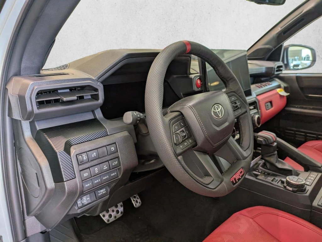 • Trd pro leather-trimmed manual tilt/telescopic steering wheel with trd badge, red center stripe, and phone, audio, display/infotainment, and driver assist controls.