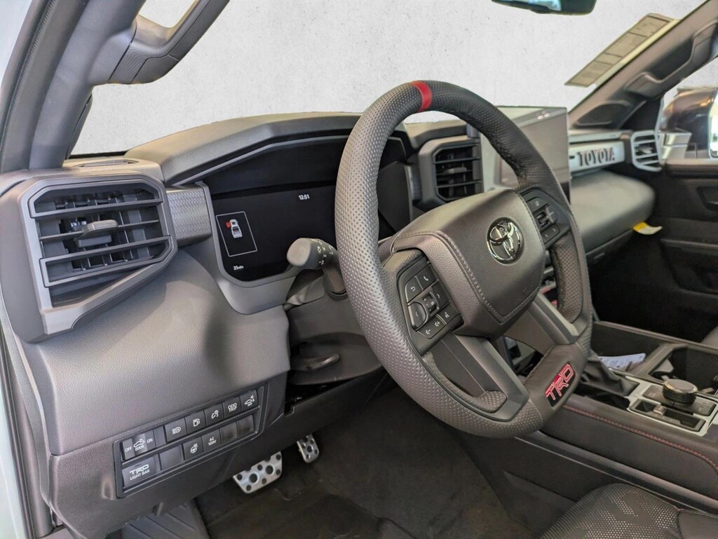 • Trd leather-wrapped manual tilt/telescopic steering wheel with trd badge, red center stripe, and phone, audio, display/infotainment, and driver assist controls.